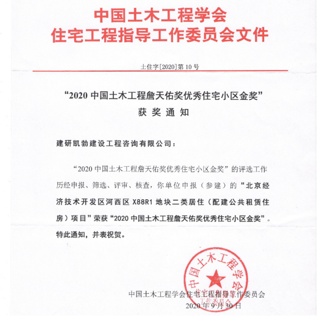 近日,建研凱勃建設工程咨詢有限公司(以下簡稱“建研凱勃”)監(jiān)理的北京經濟技術開發(fā)區(qū)河西區(qū)X88R1地塊二類居住(配建公共租賃住房)項目榮獲2020中國土木工程詹天佑獎優(yōu)秀住宅小區(qū)金獎,這是繼該項目獲得北京市結構長城杯金質獎后的又一重大獎項。