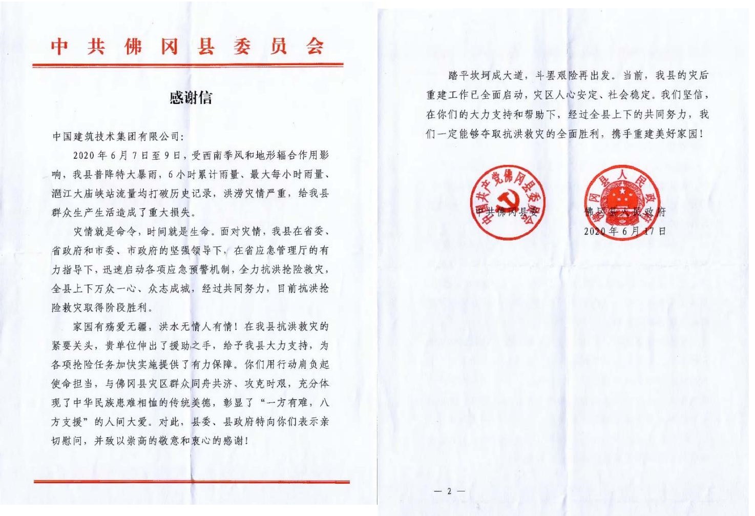 6月17日、6月23日第六工程分公司清遠恒大御泉四季花園總承包項目部及第六工程分公司黨支部接連收到了清遠市中共佛岡縣委、佛岡縣人民政府、中共洛洞村總支部委員會的感謝信,感謝信內容主要是針對中技集團清遠恒大御泉四季花園總承包項目部及第六工程分公司黨支部在6月7日至6月9日清遠市佛岡縣發生的50年一遇的洪災中做出的巨大貢獻表示真誠的感謝。?