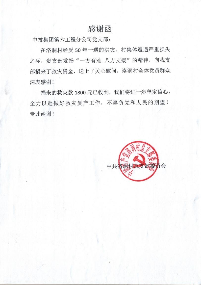 災區黨委及政府為感謝我司及六分黨支部在災情中的巨大貢獻特致感謝信,高度贊許我們“用行動肩負起使命擔當”,表達了對我司“一方有難,八方支援”幫助受災的湯塘同胞度過難關的感激情懷,同時對我司和六分黨支部組織的“情系湯塘,搶險救災,愛心捐贈”活動以及為災區所捐的物資和款項表示由衷的感謝!