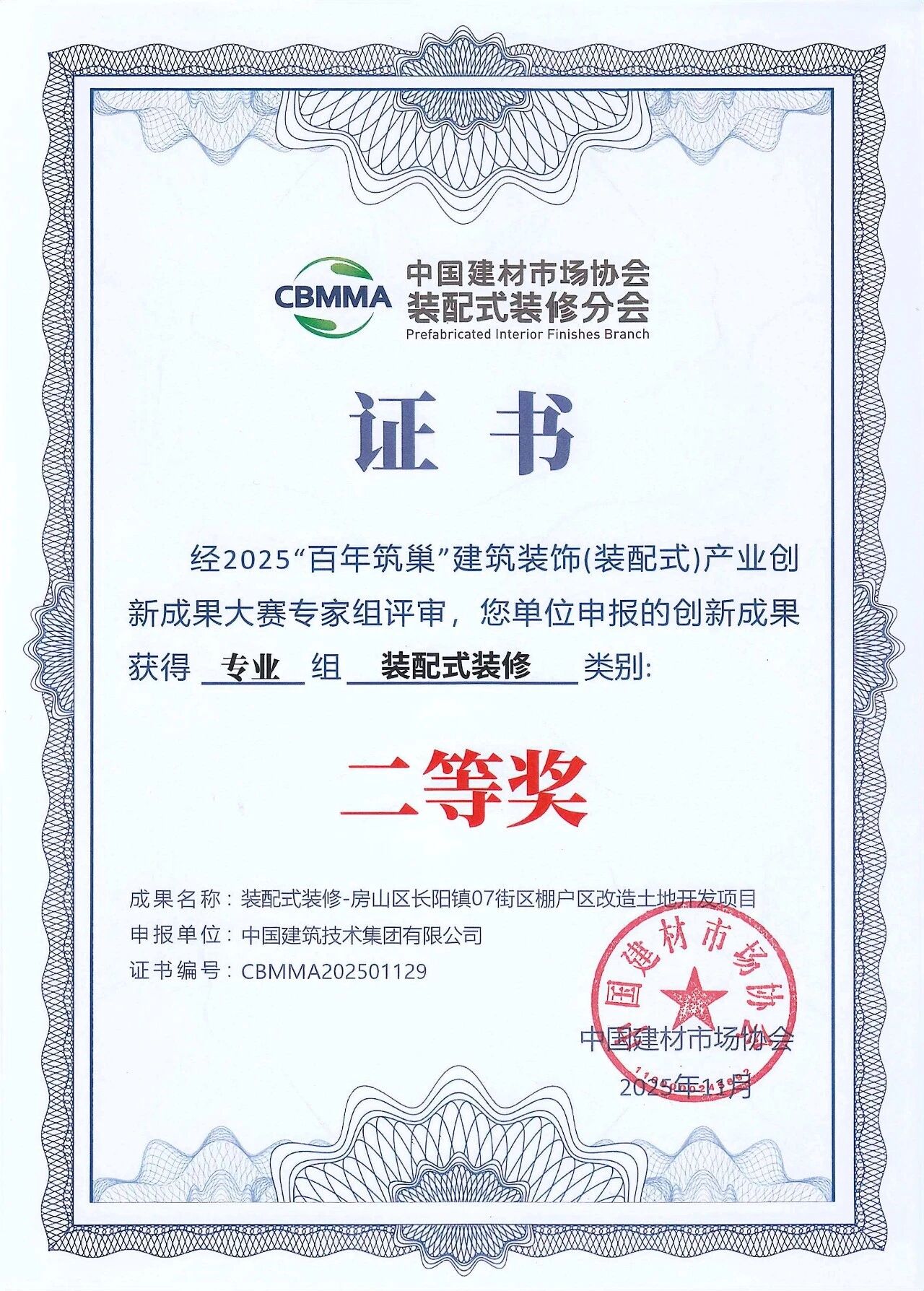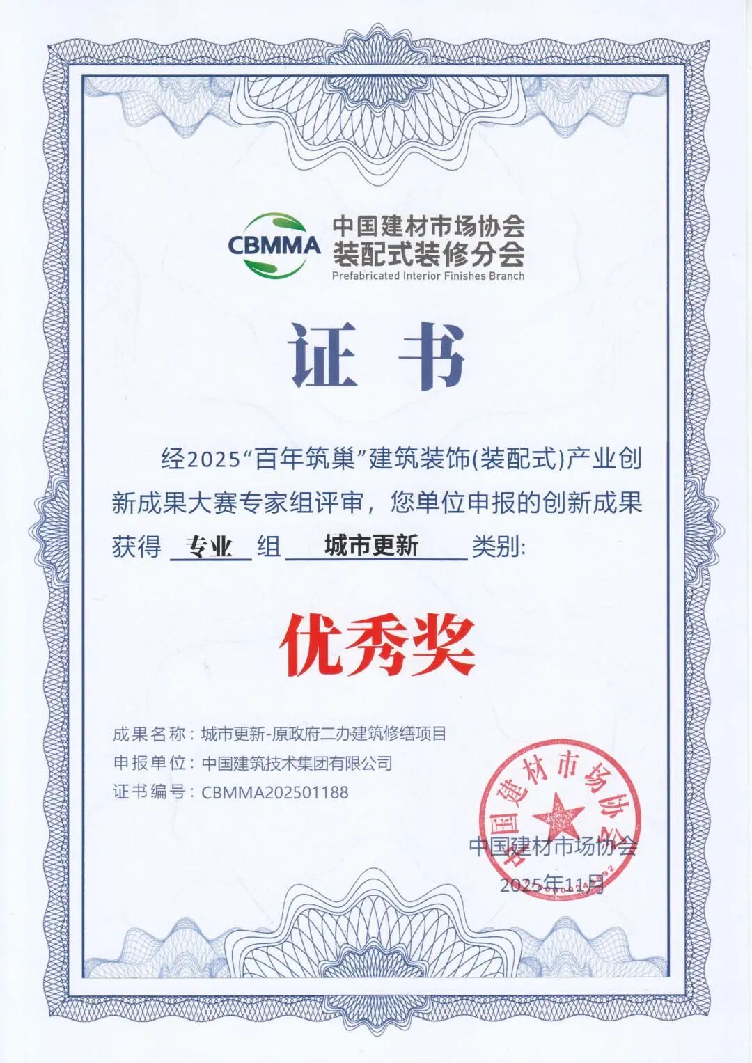 作為行業內首個以“裝配式”為核心的高規格賽事,“百年筑巢”創新成果大賽代表了我國建筑裝飾裝配化發展的新方向與高水準,獲獎項目在技術體系、綠色性能與實施效果方面均獲得評審專家高度認可。此次獲獎充分展現了中國建技在裝配式裝修與城市更新領域的前瞻布局與專業能力,是對中國建技技術硬實力及創新軟實力的雙重認證也標志著中國建技在裝配式裝修與城市更新領域的領先地位。