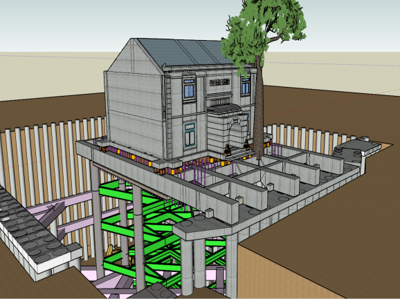 該建筑原為公安部辦公樓,始建于民國時期,是西城區重點保護文物。建筑占地面積約400平方米,東西長約15米,南北長約14米,地上兩層,地下基坑深度達20米。在該地塊開發過程中,需在建筑周邊及下方進行基坑開挖,同時西側地鐵19號線太平橋站B口的施工也在同步進行。為確保歷史建筑的安全,項目團隊對其進行了原址托換處理。