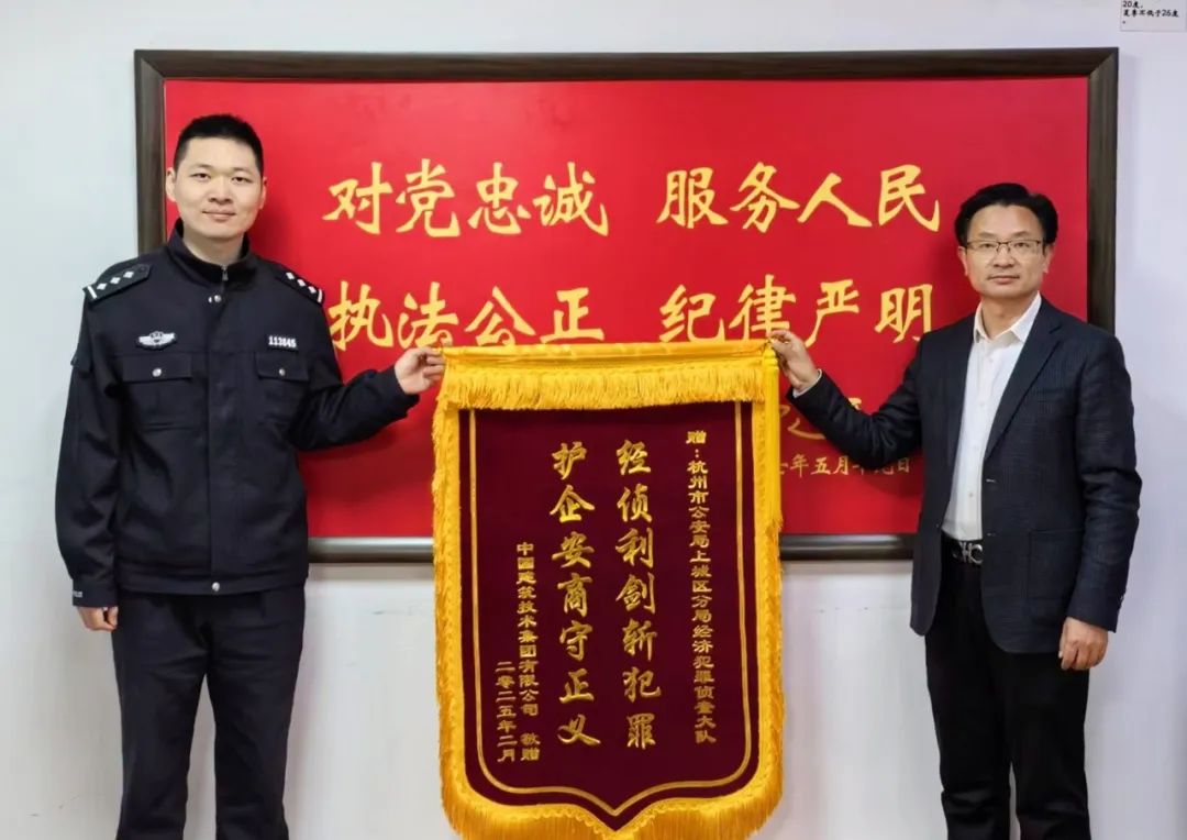 2月27日,中國建技黨委副書記、總經理余湘北,黨委副書記、紀委書記李小陽,法務楊建旭一行專程赴杭州市上城區經濟犯罪偵查大隊,向辦案民警代表送錦旗,對經偵大隊在偵辦中國建技原浙江分公司總經理系列重大犯罪案件中展現的專業能力表示由衷欽佩,對其高效行動致以誠摯謝意。