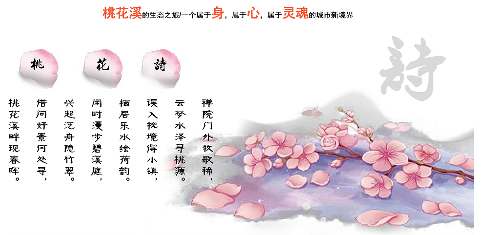 文化景觀打造——結合開福區福文化,重構桃花溪的生態系統,沿溪以綠道的方式組織內部流線,打造桃花溪八景,以景點串聯功能區,銜接周邊場地互相帶動,構建新型城市都市休閑新空間。