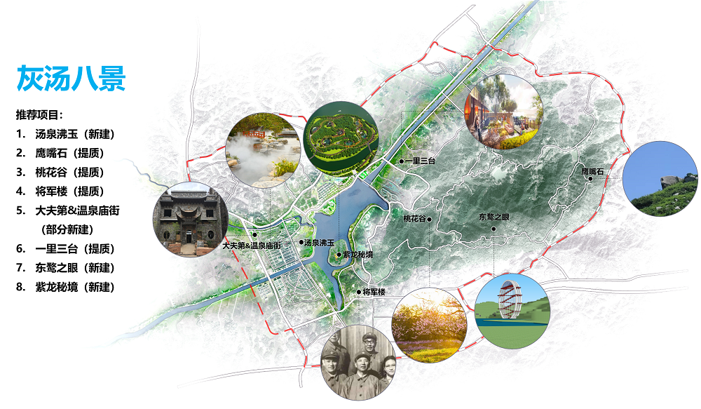 規劃形成“兩公園一小鎮、八景點一通廊”的空間結構,以紫龍湖為核心打造溫泉康養文化公園;結合東鶩山打造山地體育公園;結合灰湯鎮區打造灰湯溫泉民俗小鎮;打“湯泉沸玉、鷹嘴石、桃花谷、將軍樓、大夫第&溫泉廟街、一里三臺、東鶩之眼、紫龍秘境”灰湯八景;依托烏江、紫龍湖、東鶩山形成山水景觀視線通廊。