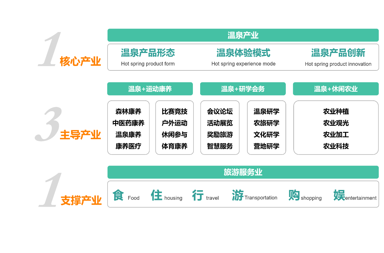 以“溫泉”為核心,以“溫泉+運動康養”、“溫泉+研學會務”、“溫泉+休閑農業”為三大主導產業以旅游服務業為支撐,構建“1+3+1”的產業體系。