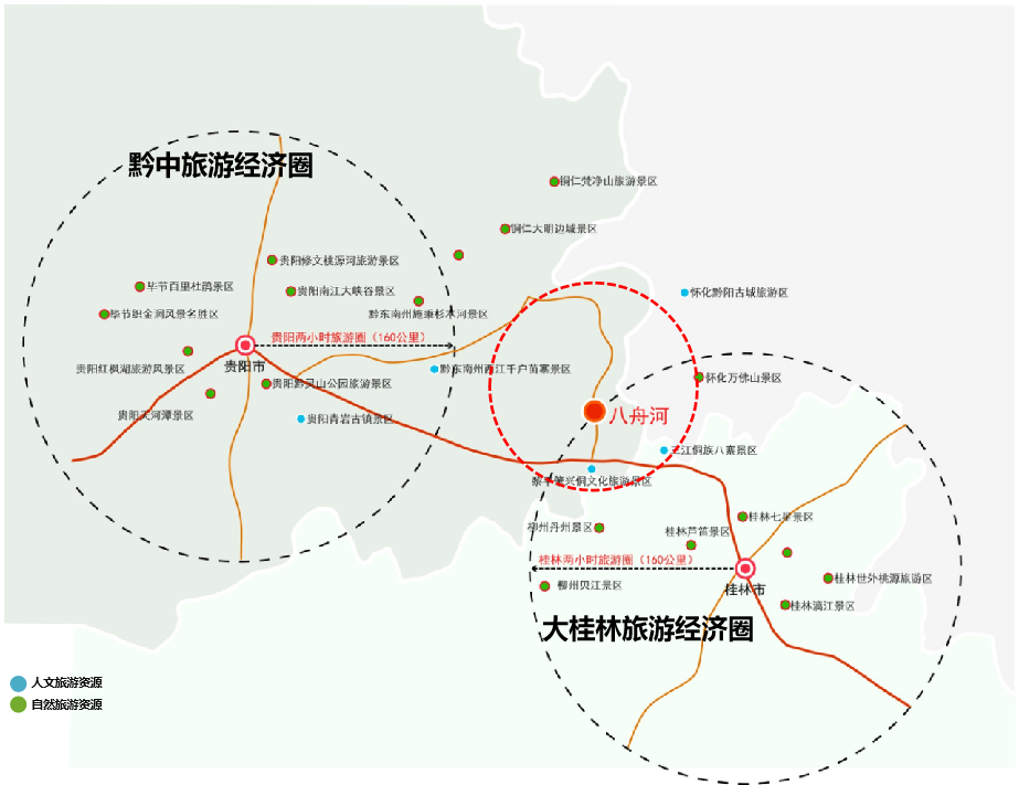 八舟河景區山水資源豐富、溪流密布,集巖溶地貌、田園溪流、河湖森林等自然景觀為一體,同時也是白茶重要產地之一、生長著多種異花異草、名貴中草藥材,具有很高的觀賞價值、科學價值、游憩價值。同時,項目地處黔中旅游圈層及大桂林旅游圈層兩小時旅游圈外圍,通過打造旅游度假綜合體恰好彌補了“貴州—桂林”兩小時旅游圈市場的空白。