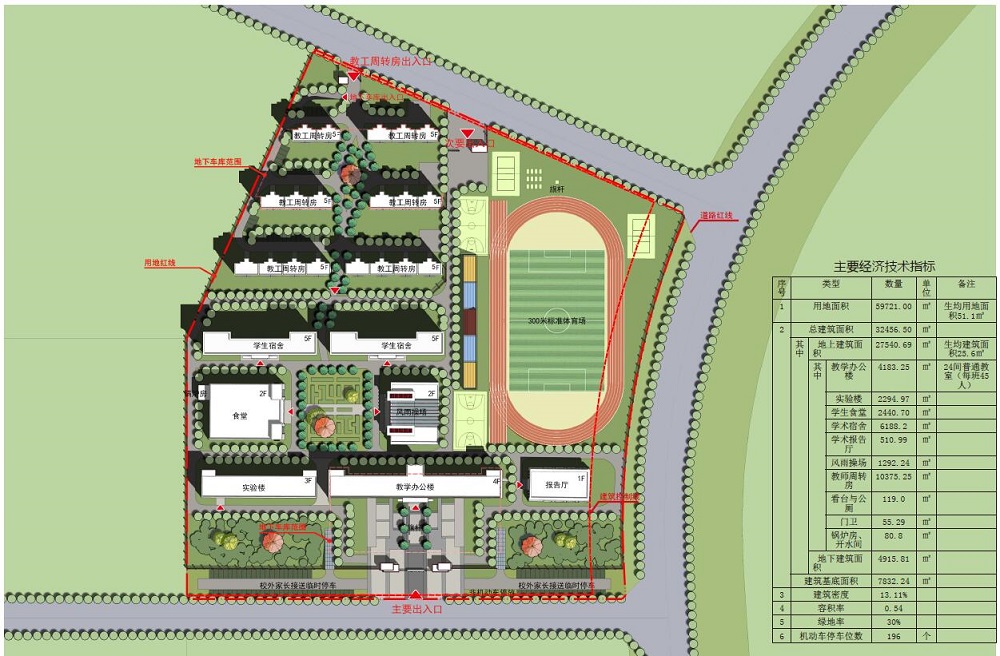 ???本項目用地位于日喀則市經濟開發區,辦學規模為24班的小學,包括教學樓、實驗樓、食堂、風雨操場、宿舍樓等建筑。規劃建設用地為59721㎡,建筑總面積為32456.5㎡,其中地上建筑面積27540.69㎡,地下建筑面積4915.81㎡。建筑密度13.11%,容積率0.54,綠地率30%,機動車停車位數196個。南側、東側、北側為規劃道路,西側緊鄰規劃曲布幼兒園和園丁苑。