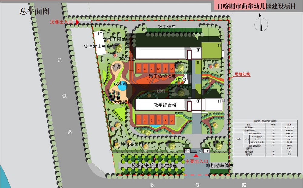 ????本項目位于日喀則珠峰開發開放試驗區教育城內,規劃為12班幼兒園,建設用地為15920.77㎡,建筑總面積為5346.21㎡,其中地上建筑面積為5156.11㎡,地下建筑面積為190.1㎡。項目用地南側為規劃道路,西側為綠化用地和規劃道路,東側和北側分別為規劃桑珠孜區第四小學和規劃園丁苑。
