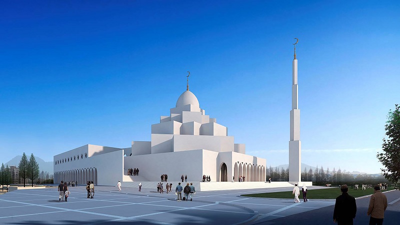 根據伊斯蘭教義和傳統,清真寺的要素 【“米哈拉布(凹壁)”、“齊布拉墻”、“禮拜殿”、“庭院”、“環廊”,以及“宣禮塔”】,永遠需要朝向麥加方向。在遵循這個傳統的同時,承啟前面的規劃思路后,建筑形體和外部環境,也發生了一些有趣的變化:在建筑的北側和東側,分別與環境形成一些缺角;利用這些缺角和地形設置臺階,又可形成多個層級的平臺,而每層平臺根據需求不同,又可布置各種與空間相適應的建筑功能。(例如,內庭院的主要出入口,就可以與東側和北側的地形結合)這種互為邏輯的關聯性,正是建筑設計的有趣之處。