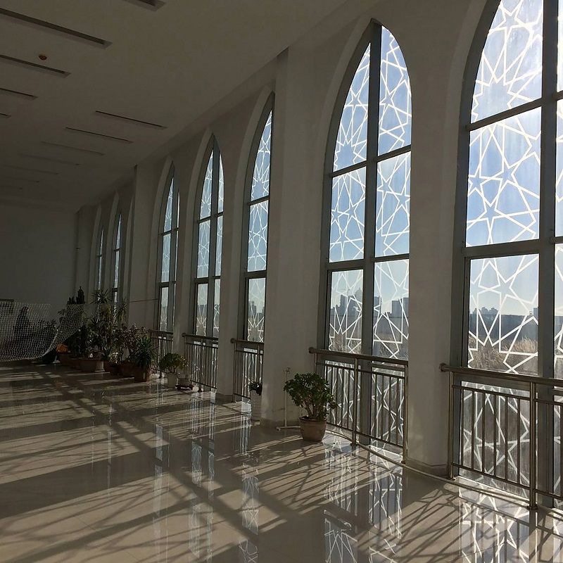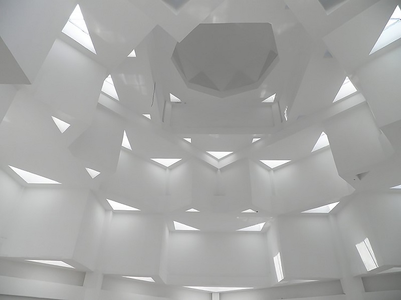 沿西北角三段式大臺階而上,可到達清真寺最重要部分的禮拜殿,也是建筑設計的“點睛”之筆:禮拜殿和穹頂的設計,運用了同構原理,將伊斯蘭紋樣進行分解、變化后,生成新的幾何形體,每一層退臺與建筑形體旋轉相結合,產生更多、更豐富的三角形平面組合,利用這些組合,為禮拜殿上空設計了“逐層退臺”的三角形采光窗。給禮拜殿帶來了豐富的自然光源。同時,一天內的光束變化,也將人引向一個深邃的、神圣的、崇高的精神空間。