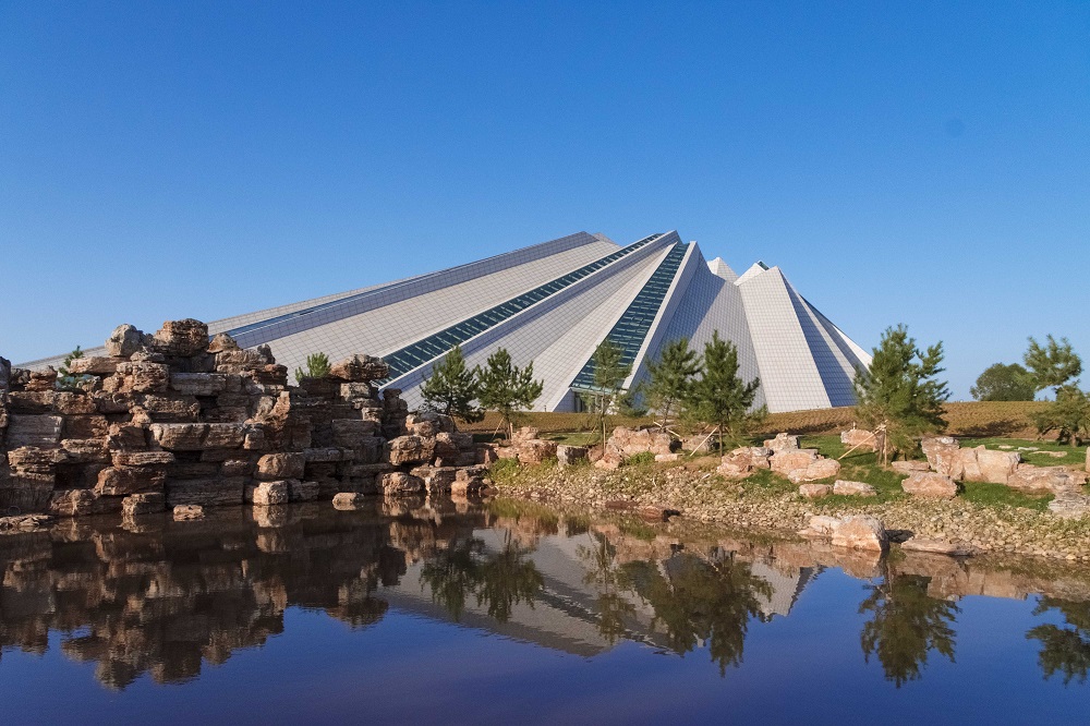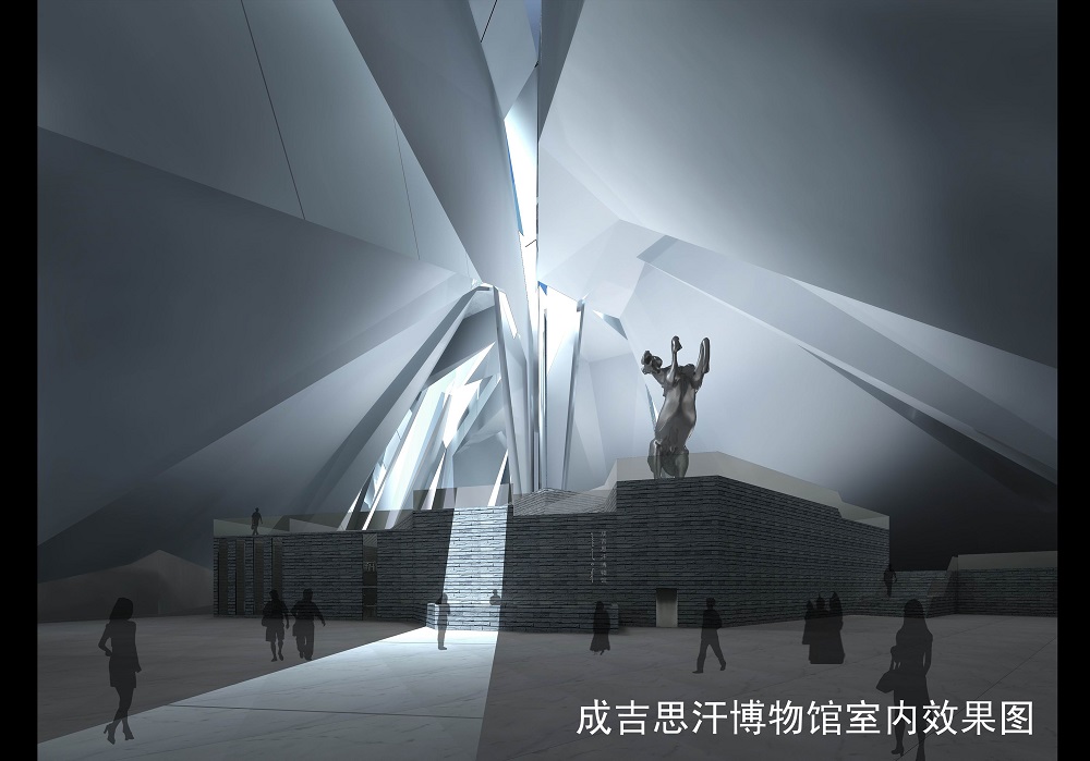 頂部的采光帶,以及鏤空處光影的引入,豐富了室內的空間,象征萬里浩瀚的星空,將人們的思緒帶到遙遠的年代,有棱角的折面,表現了成杰思汗時代的力量。