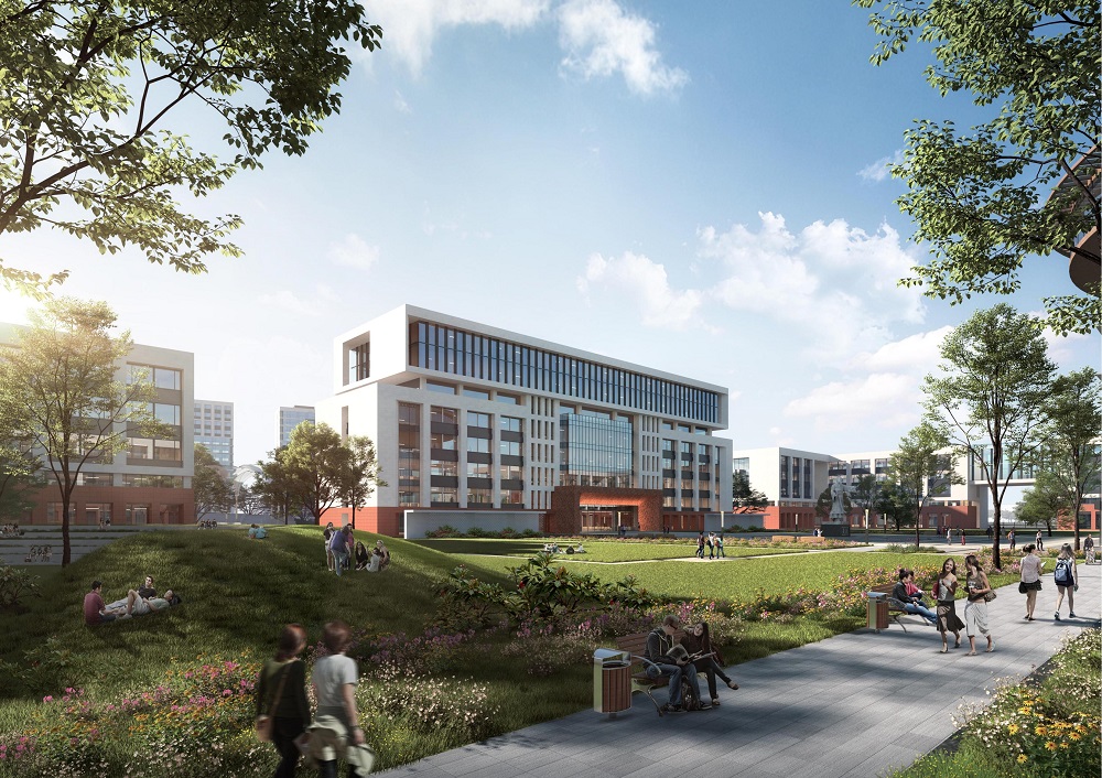 項目總占地426.83畝,以“自成一城”的氣勢跳出了現有格局。在前期規劃設計中,我們借鑒了《周禮·考工記》中“匠人營國,方九里,旁三門。國中九經九緯,經涂九軌。”和“南園北苑,前朝后市”的中國傳統城市營造手法,同時融入本土中原文化符號,引古論今,從城市層面打造屬于棗莊的“花園校園”。