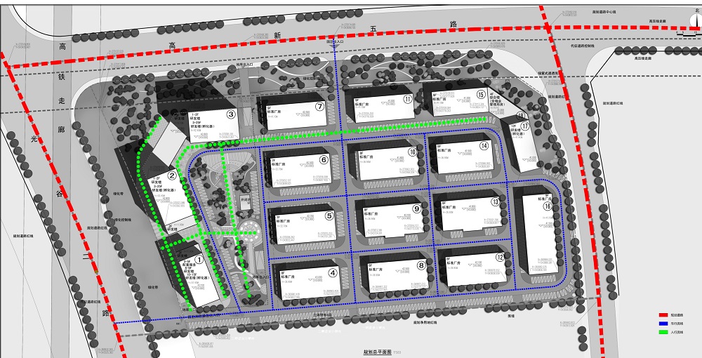 根據對場地周邊環境及場地本身的特點,結合高新區規劃局的規劃設計要求,本方案分別在光谷二路及高新五路布置主要出入口,結合中心花園設計,通過南北、東西方向兩條主要視覺景觀軸線塑造園區良好的景觀形象。從而打造高檔建筑標準,優異的環境品質新型高端研發生產園區。建筑空間布局北高南低,在高新五路與光谷二路交叉口處設置兩棟標志性25層孵化器研發大樓。沿高新五路設置9層研發車間,基地內部建筑層數高低錯落,整個建筑群天際線變化豐富。